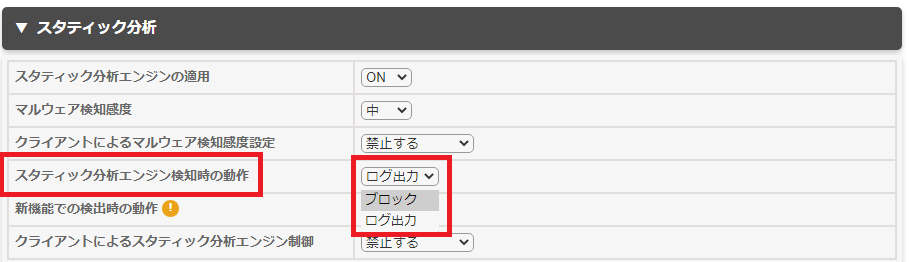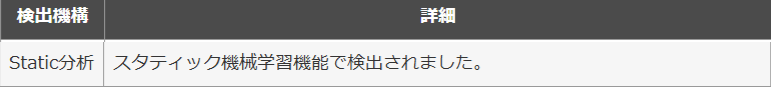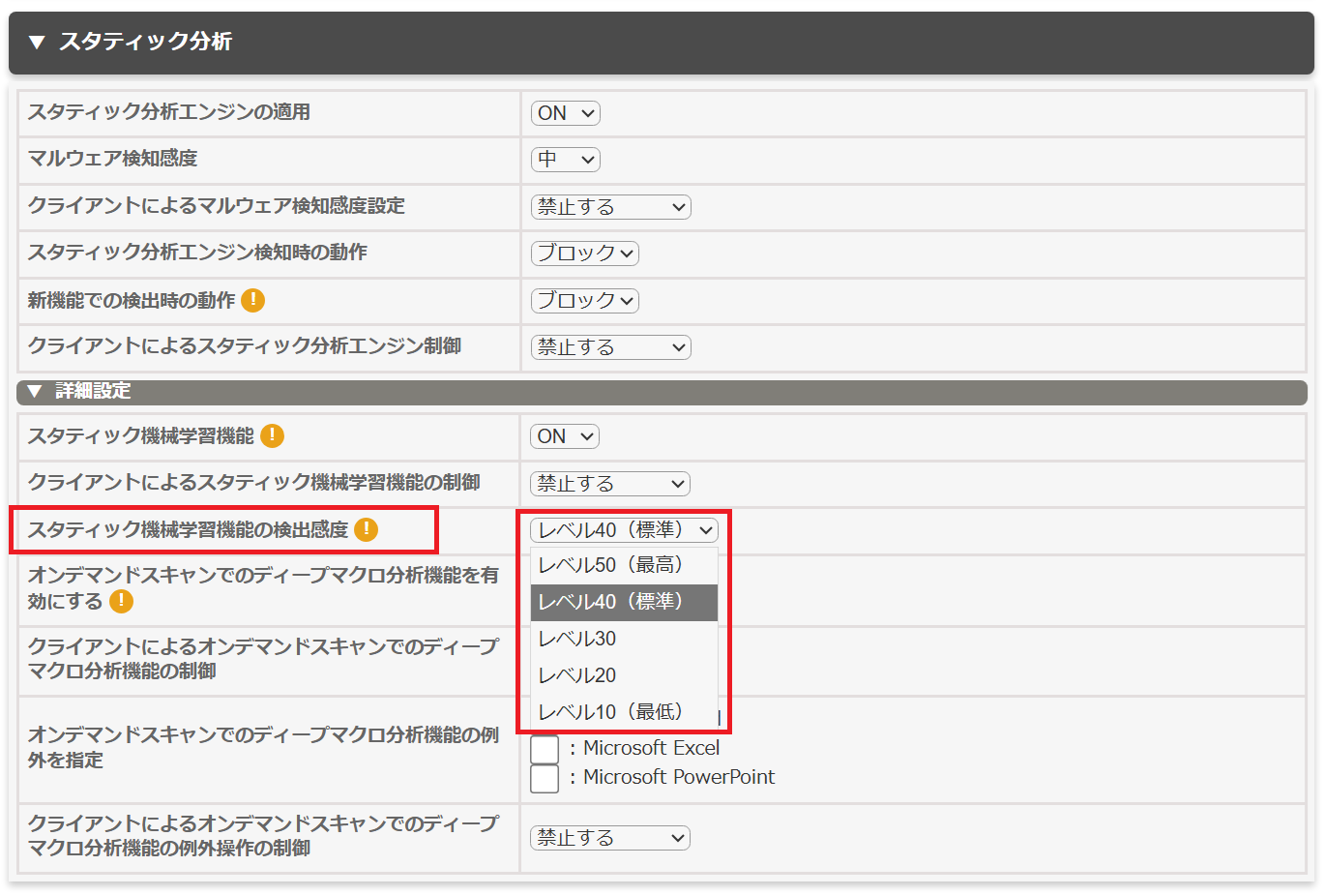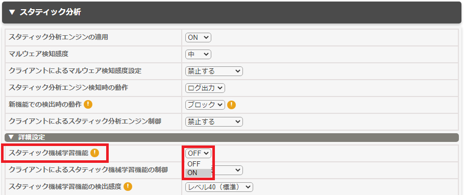 上述の検知エンジンおよび検知理由での過検出が頻発する場合、「ポリシー設定」>「スタティック分析」>「詳細設定」から、「スタティック機械学習機能の検出感度」を低いレベルに調整いただくことで過検出の低減が可能です。